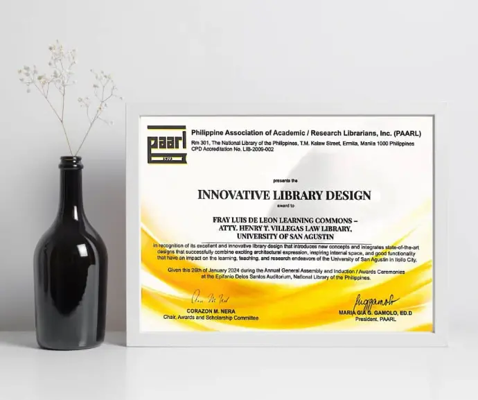 Dedicated to Excellence: The Philippine Association of Academic/Research Librarians, Inc. (PAARL) has awarded the Innovative Library Design Award to Fray Luis De Leon Learning Commons and Atty. Henry T. Villegas Law Library in recognition of its excellent and innovative library design that introduces new concepts and integrates state-of-the-art designs that successfully combine exciting architectural expression, inspiring internal space, and good functionality that have an impact on the learning, teaching, and research endeavors of the University of San Agustin, Iloilo City.